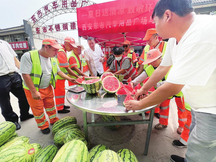 環(huán)衛(wèi)人員領(lǐng)取西瓜“師傅們,快來(lái)歇會(huì)兒,環(huán)稿愛(ài)吃一塊冰鎮(zhèn)西瓜!衛(wèi)工衛(wèi)服”7月22日10時(shí)許,人送西安市未央?yún)^(qū)六村堡街道東市汽車(chē)用品廣場(chǎng)門(mén)口熱鬧非凡,愛(ài)心六村堡街道辦事處組織轄區(qū)東市汽車(chē)用品廣場(chǎng)及陜西翰祺新能源有限責(zé)任公司西安北三環(huán)加油站帶來(lái)了慰問(wèn)品,活動(dòng)大家一邊搬卸物資,新聞心企一邊熱情地招呼著環(huán)衛(wèi)人員,業(yè)捐200余名環(huán)衛(wèi)人員放下掃帚圍在一起,贈(zèng)環(huán)原本安靜的企業(yè)市場(chǎng)瞬間變成了充滿歡聲笑語(yǔ)的“清涼驛站”。